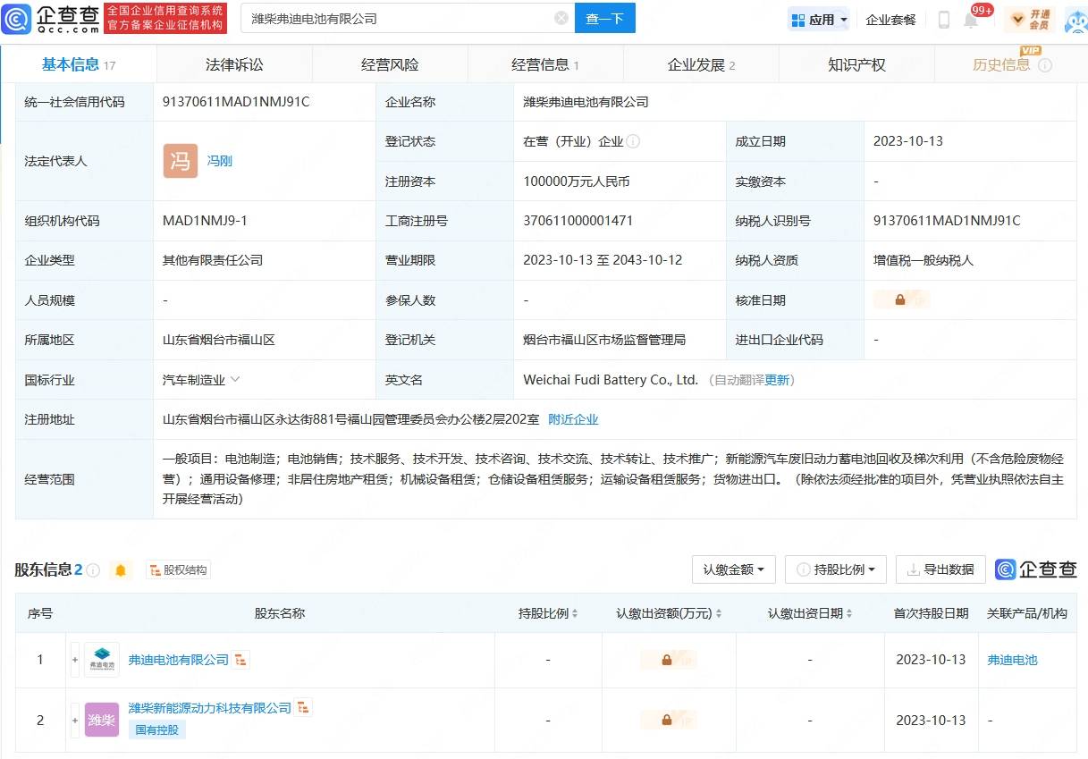 近日,濰柴弗迪電池有限公司成立,法定代表人為馮剛,注冊資本10億,經(jīng)營范圍含電池制造,電池銷售,技術服務、技術開發(fā)、技術咨詢、技術交流、技術轉讓、技術推廣,新能源汽車廢舊動力蓄電池回收及梯次利用等。
