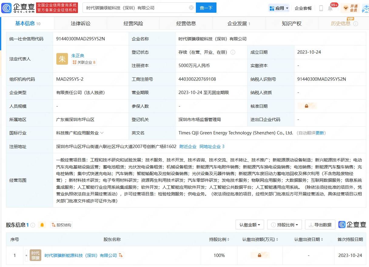 近日,時代騏驥綠能科技(深圳)有限公司成立,法定代表人為朱正良,注冊資本5000萬元人民幣,經(jīng)營范圍包含:新能源原動設(shè)備制造、電動汽車充電基礎(chǔ)設(shè)施運營、光伏發(fā)電設(shè)備租賃、人工智能行業(yè)應(yīng)用系統(tǒng)集成服務(wù)等。