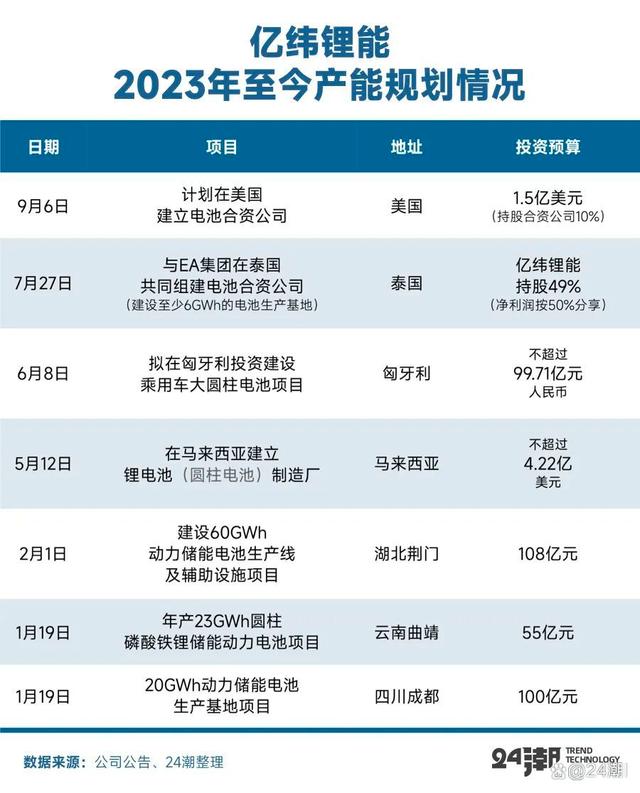 另據(jù)24潮團(tuán)隊統(tǒng)計,在5月、6月和7月億緯鋰能三次發(fā)布擴(kuò)張公告,其計劃投入上百億資金在馬來西亞、匈牙利和泰國獨資或合資建設(shè)電池基地項目,詳見下表