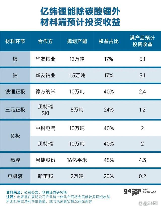 據(jù)華福證券預(yù)測,2022年億緯鋰能碳酸鋰可自供量約為2779噸,自供比列約為14%,未來還將逐年快速提升,至2024年其碳酸鋰自供比例將升至33%,根據(jù)其長遠(yuǎn)產(chǎn)能規(guī)劃,未來很可能達(dá)到49%;而億緯鋰能在上游鈷鎳、正負(fù)極材料、隔膜以及電解液等材料領(lǐng)域的產(chǎn)業(yè)布局一旦滿產(chǎn)后,預(yù)計合計將實現(xiàn)22.3億元的投資收益。