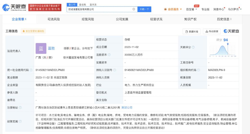 南方財(cái)經(jīng)11月7日電,天眼查App顯示,近日,防城港蓄能發(fā)電有限公司成立,法定代表人為藍(lán)勝,注冊(cè)資本3億人民幣,經(jīng)營(yíng)范圍含水力發(fā)電、電氣安裝服務(wù)、通用設(shè)備修理、電氣設(shè)備修理、工程管理服務(wù)、發(fā)電技術(shù)服務(wù)、單位后勤管理服務(wù)、非居住房地產(chǎn)租賃等。股東信息顯示,該公司由南網(wǎng)儲(chǔ)能全資持股。
