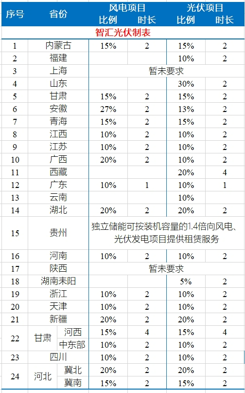 今年以來(lái),全國(guó)各省陸續(xù)要求集中式新能源項(xiàng)目配儲(chǔ)。本文統(tǒng)計(jì)了24省/地區(qū)的配儲(chǔ)最低比例,如下表所示。