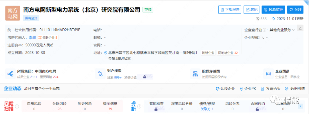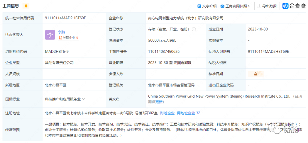 10月30日,南方電網(wǎng)新型電力系統(tǒng)(北京)研究院有限公司注冊成立,法定代表人為李鵬,注冊資本5億元人民幣,該公司由中國南方電網(wǎng)有限責(zé)任公司及旗下南方電網(wǎng)數(shù)字電網(wǎng)集團有限公司、南方電網(wǎng)科學(xué)研究院有限責(zé)任公司共同持股。