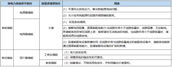 目前,儲能技術(shù)主要應(yīng)用于電力系統(tǒng)。具體而言,可以將儲能技術(shù)在電力系統(tǒng)中的典型應(yīng)用場景劃分為電源側(cè)、電網(wǎng)側(cè)和用戶側(cè)三個方面。其中電源側(cè)、電網(wǎng)側(cè)儲能又稱為表前儲能或大儲,用戶側(cè)儲能又稱為表后儲能。用戶側(cè)儲能分為工商業(yè)儲能與戶儲,兩者區(qū)別在于客戶群體。