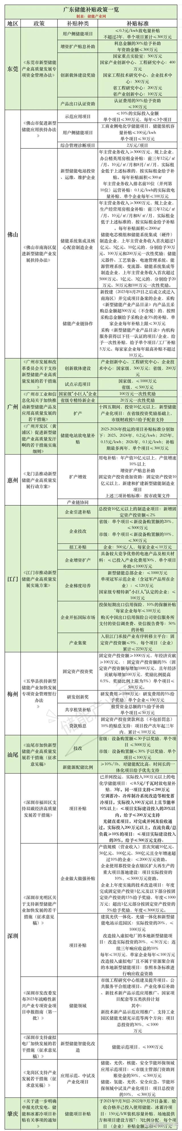 廣東省各市區(qū)縣級(jí)政府出臺(tái)儲(chǔ)能獎(jiǎng)補(bǔ)政策如下。