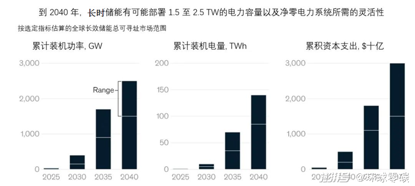 2021年,全球知名咨詢公司麥肯錫和長期儲能協(xié)會(LDES)發(fā)布的一份報告表示,到2040年,LDES 有可能在全球部署 1.5 至 2.5 TW)(太瓦)的裝機容量,是當前部署的總儲能容量的8到15倍。對應(yīng)的儲能容量是 85-140TWh)(太瓦時 )。