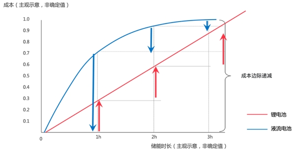 圖:鋰電池與液流電池的投資成本示意