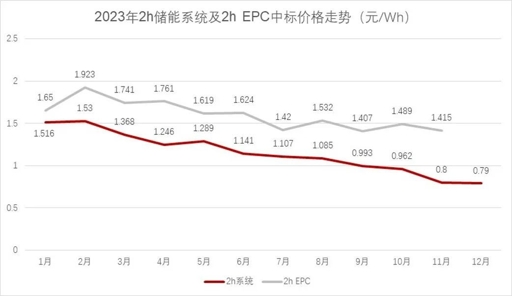 短短一年時(shí)間,儲(chǔ)能系統(tǒng)價(jià)格已經(jīng)幾近腰斬。來自中關(guān)村儲(chǔ)能產(chǎn)業(yè)技術(shù)聯(lián)盟(CNESA)的統(tǒng)計(jì),到2023年年末,2小時(shí)儲(chǔ)能系統(tǒng)中標(biāo)均價(jià)已經(jīng)跌至0.79元/Wh,較年初下降48%。而這還僅僅是平均價(jià),一些企業(yè)的報(bào)價(jià)還在平均價(jià)格之下。