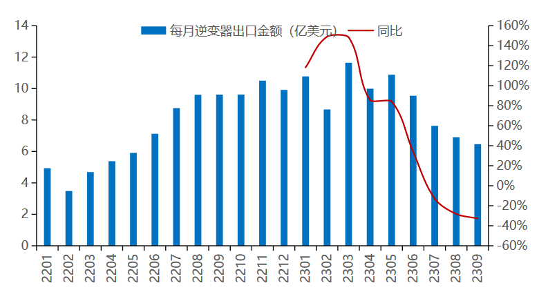 2023年9月國內(nèi)出口光儲(chǔ)逆變器金額6.5億美元,同比-33%,環(huán)比-6%;