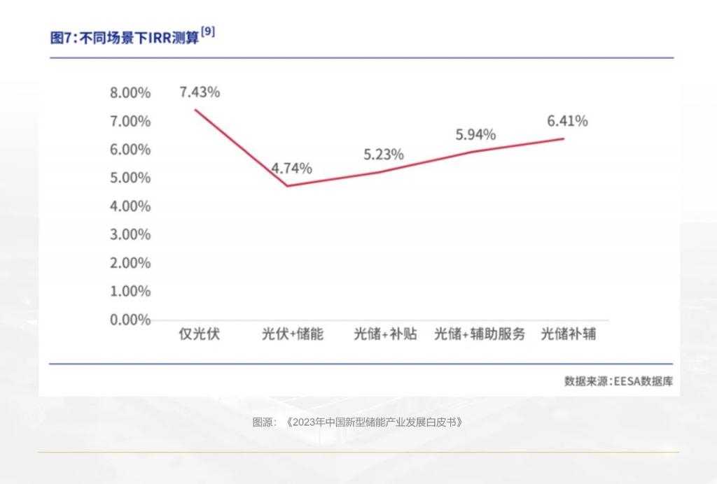《2023 中國新型儲能行業(yè)發(fā)展白皮書》測算顯示:以內(nèi)蒙古某 100MW 光伏發(fā)電項(xiàng)目、配套 20MW/40MWh 儲能電站為例,其內(nèi)部收益率(IRR)在僅光伏發(fā)電的情景下,高達(dá) 7.43%;而配上儲能后,即便獲得政府補(bǔ)貼同時(shí)參與輔助服務(wù),IRR 也僅 6.41%。