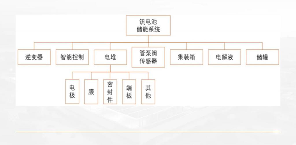 以釩液流電池為例,整個(gè)釩電池儲能系統(tǒng)主要由電堆、電解液、逆變器、智能控制、儲罐、集裝箱、管泵閥傳感器幾部分構(gòu)成。