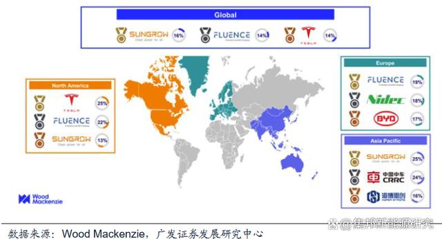 根據(jù)WoodMackenzie數(shù)據(jù),2022年北美前三大集成商分別為特斯拉、Fluence、陽光電源,市場份額分別為23%、22%、13%,頭部集成商份額進一步提升。