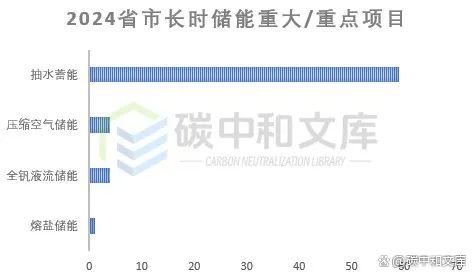 而在長(zhǎng)時(shí)儲(chǔ)能中,抽水蓄能項(xiàng)目最多,59項(xiàng),總占長(zhǎng)時(shí)儲(chǔ)項(xiàng)目的86.8%,其次是全釩液流儲(chǔ)能和壓縮空氣儲(chǔ)能各4項(xiàng),其中全釩液流儲(chǔ)能項(xiàng)目均來自四川省,而熔鹽儲(chǔ)能項(xiàng)目最少,僅有1項(xiàng),來自山東省。