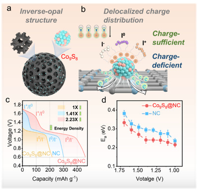 鑒于此,胡海波教授和合作者,設(shè)計開發(fā)了一種具有反蛋白石結(jié)構(gòu)的Co9S8@NC復(fù)合催化劑,以其缺電荷態(tài)的特點(diǎn)調(diào)控對碘物種的吸附作用,從而提高I+/I0/I-兩電子連級反應(yīng)動力學(xué)。同時,其高比表面積,減輕了與碘氧化還原過程相關(guān)的能量壁壘。這些結(jié)構(gòu)特征又為調(diào)節(jié)碘氧化還原過程的動力學(xué)提供了有效手段。該工作為開發(fā)基于多重電子轉(zhuǎn)移反應(yīng)的、兼具高能量密度和高功率密度碘電極化學(xué)提供了模型系統(tǒng)和理論框架(Advanced Materials, 2024, DOI: 10.1002/adma.202312246)。