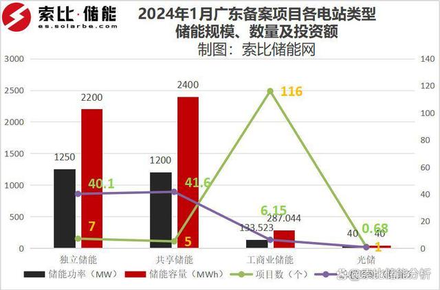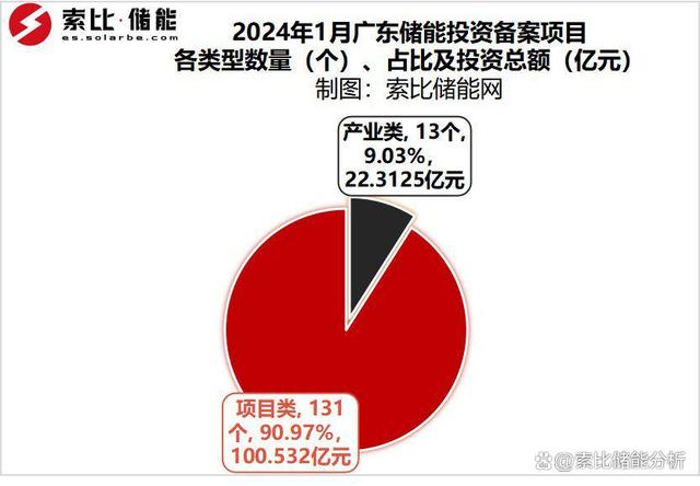 據(jù)索比儲能網(wǎng)不完全統(tǒng)計,2024年1月,廣東省儲能投資備案項目144個,總投資金額達122.8444995億元。其中產(chǎn)業(yè)類項目13個,投資額22.3125億元;項目類131個,規(guī)模為2723.523MW/ 5727.044MWh,投資金額100.5319995億元。