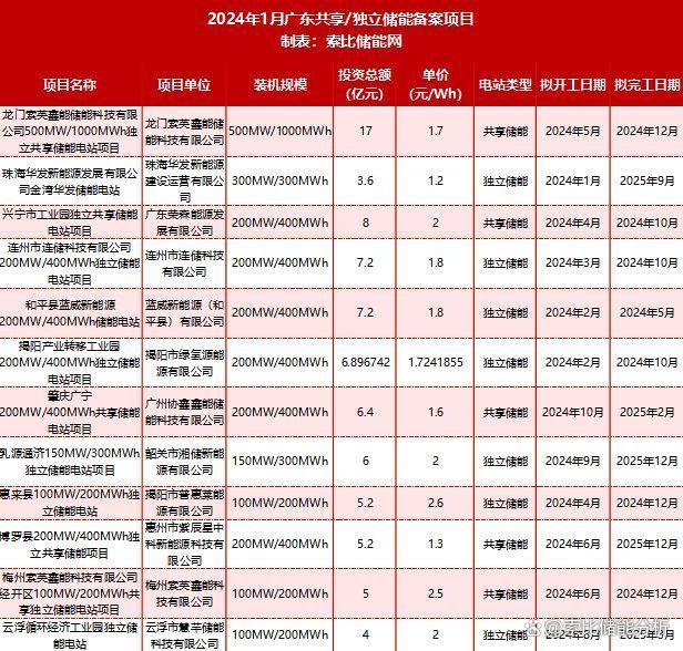12個獨立/共享儲能項目均在2024年開工,其中規(guī)模共計1500MW/3000MWh的7個項目擬于年內(nèi)完工。12個項目中,除珠海華發(fā)新能源發(fā)展有限公司的金灣華發(fā)儲能電站項目為1h儲能外,其余11個的儲能時長均為2h,投資單價區(qū)間在1.3-2.6元/Wh。