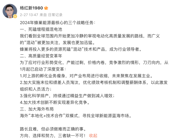 在這條微博中,楊紅新指出了2024年蜂巢能源最核心的三個戰(zhàn)略任務,除了上述“高質(zhì)量經(jīng)營變革”的任務,還包括死磕增程插混電池、加大海外布局兩項。