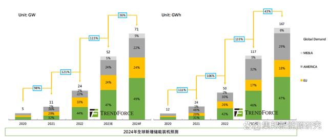 展望2024年,TrendForce集邦咨詢預(yù)計,24年全球儲能新增裝機有望達71GW/167GWh,同比增長36%/43%,保持高增。