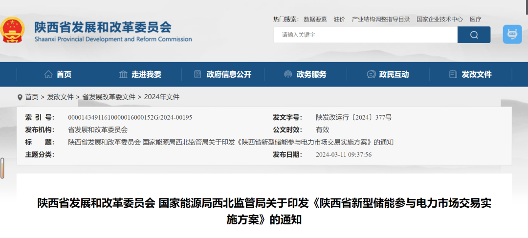 陜西省發(fā)展和改革委員會 國家能源局西北監(jiān)管局關(guān)于印發(fā)《陜西省新型儲能參與電力市場交易實施方案》的通知
