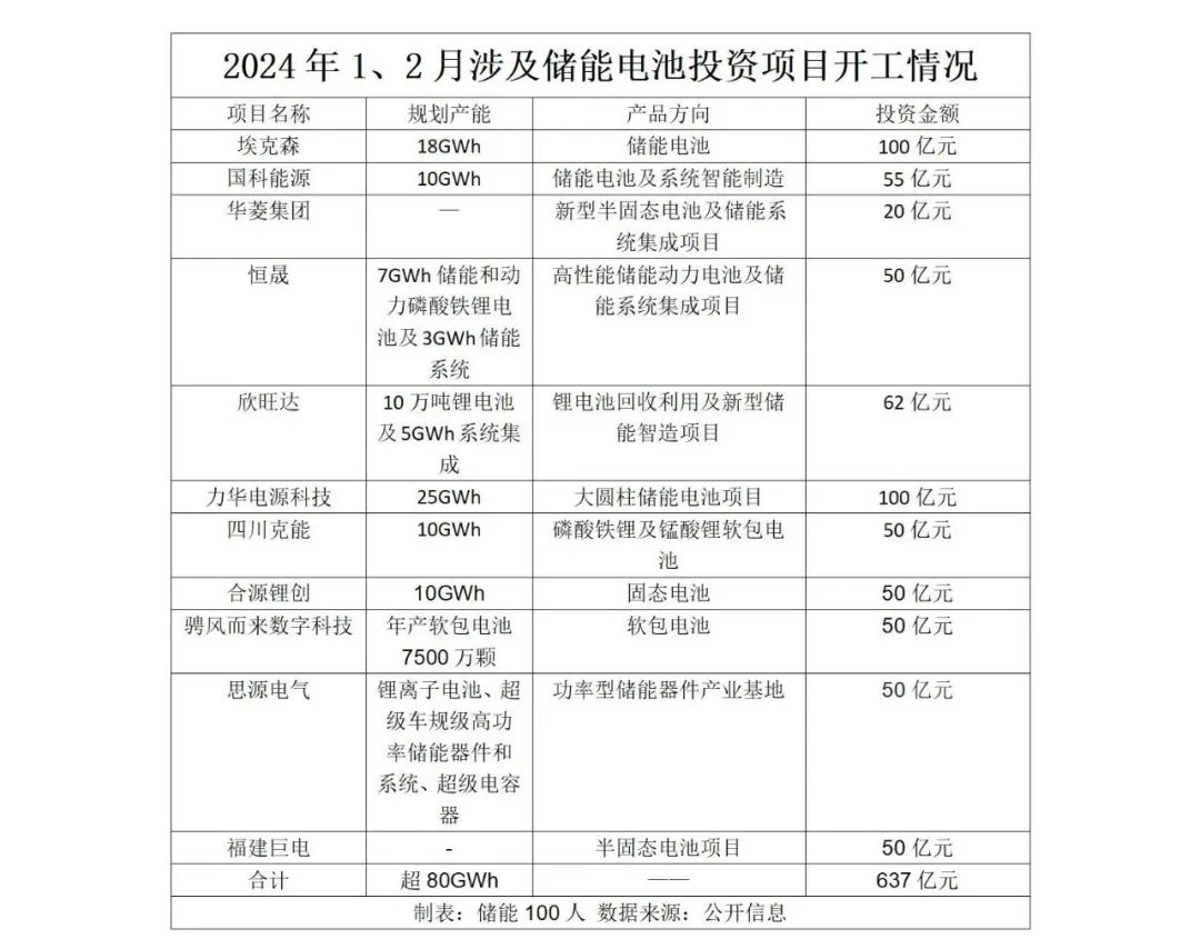 2024年剛開局,儲(chǔ)能電池?cái)U(kuò)產(chǎn)不停歇。據(jù)統(tǒng)計(jì),1、2月涉及儲(chǔ)能電池的開工項(xiàng)目已超過10個(gè),總產(chǎn)能超80GWh,總投資超600億元。