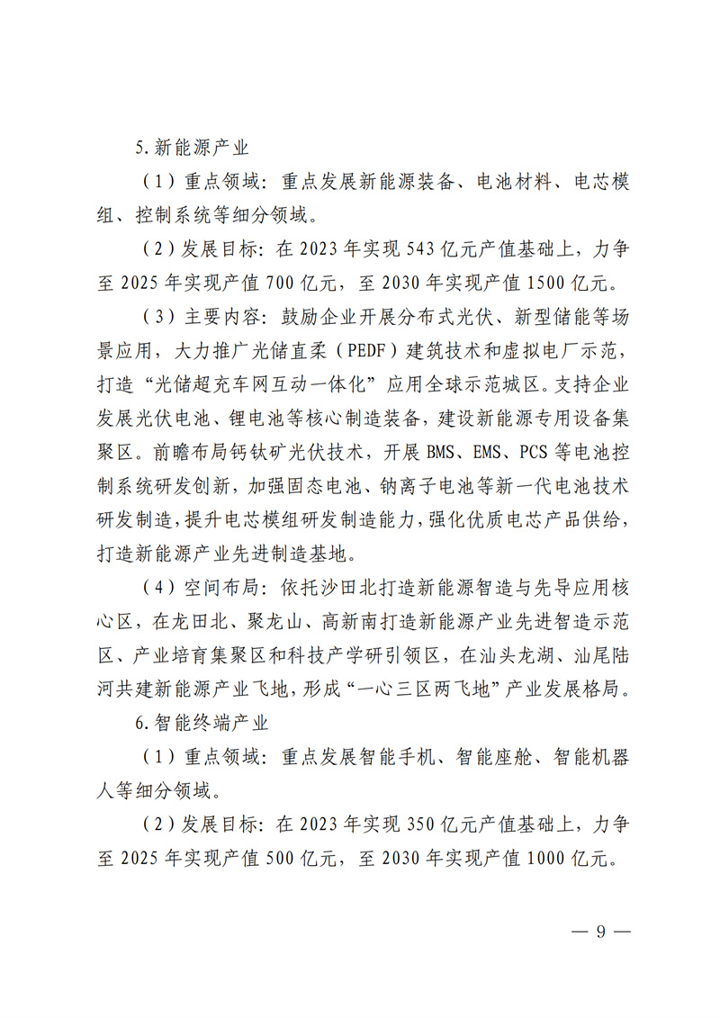 3月14日,坪山區(qū)人民政府發(fā)布關(guān)于打造具備國(guó)際競(jìng)爭(zhēng)力的產(chǎn)業(yè)集群和培育具有發(fā)展?jié)摿Φ漠a(chǎn)業(yè)集群的意見,文件指出,在2023年實(shí)現(xiàn)543億元產(chǎn)值基礎(chǔ)上,力爭(zhēng)至2025年實(shí)現(xiàn)產(chǎn)值700億元,至2030年實(shí)現(xiàn)產(chǎn)值1500億元。主要內(nèi)容涉及鼓勵(lì)企業(yè)開展分布式光伏、新型儲(chǔ)能等場(chǎng)景應(yīng)用,大力推廣光儲(chǔ)直柔(PEDF)建筑技術(shù)和虛擬電廠示范,打造“光儲(chǔ)超充車網(wǎng)互動(dòng)一體化”應(yīng)用全球示范城區(qū)。支持企業(yè)發(fā)展光伏電池、鋰電池等核心制造裝備,建設(shè)新能源專用設(shè)備集聚區(qū)。前瞻布局鈣鈦礦光伏技術(shù),開展BMS、EMS、PCS等電池控制系統(tǒng)研發(fā)創(chuàng)新,加強(qiáng)固態(tài)電池、鈉離子電池等新一代電池技術(shù)研發(fā)制造,提升電芯模組研發(fā)制造能力,強(qiáng)化優(yōu)質(zhì)電芯產(chǎn)品供給,打造新能源產(chǎn)業(yè)先進(jìn)制造基地。