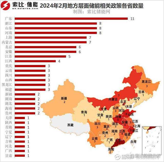 從地域出發(fā),2月地方層面出臺(tái)的儲(chǔ)能相關(guān)政策分布在30個(gè)省市地區(qū),其中廣東憑借11條儲(chǔ)能相關(guān)政策領(lǐng)跑全國。