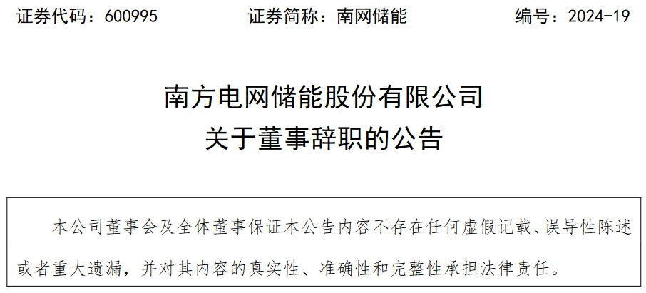 南網(wǎng)儲(chǔ)能于4月16日發(fā)布晚間公告稱,2024年4月16日,南方電網(wǎng)儲(chǔ)能股份有限公司(以下簡(jiǎn)稱“公司”)董事會(huì)收到非獨(dú)立董事江裕熬先生遞交的書(shū)面辭職報(bào)告,江裕熬先生由于達(dá)到法定退休年齡,申請(qǐng)辭去公司董事及董事會(huì)科技創(chuàng)新委員會(huì)委員職務(wù)。