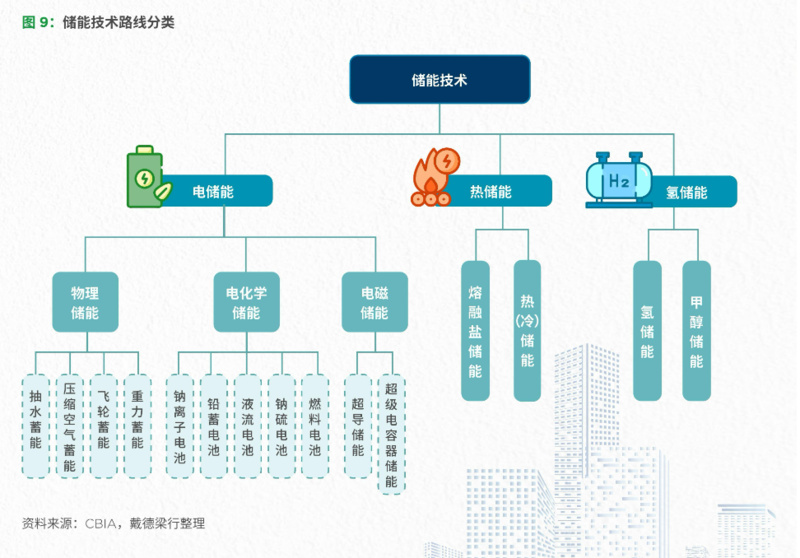 儲能,是指通過不同方式、利用特定的裝置或物理介質(zhì),將不同形式的能量儲存起來,以便在需要時利用的技術(shù)。根據(jù)技術(shù)路徑不同,儲能形式主要分為電儲能、熱儲能和氫儲能三大類,其中電化學(xué)與物理儲能為現(xiàn)階段主要技術(shù)路線。儲能系統(tǒng)是新型電力系統(tǒng)有效的調(diào)峰調(diào)頻、平滑波動手段及重要的備用資源,大力發(fā)展儲能對提高光伏、風(fēng)電等可再生能源利用率,實(shí)現(xiàn)“雙碳”目標(biāo)具有重要意義。