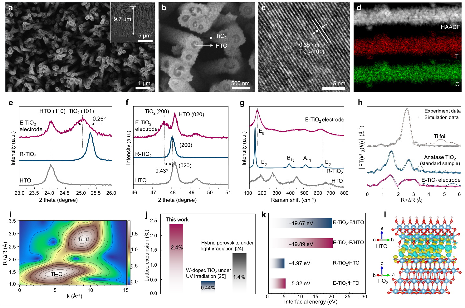 要點2:SEM(圖2a,b)表明晶格膨脹二氧化鈦(E-TiO2)具有核殼結構的納米線陣列。SAED以及HRTEM發(fā)現(xiàn)E-TiO2中的TiO2和HTO均為準單晶結構(圖2c)。EDSmapping表明O元素與Ti元素的均勻分布(圖2d)。XRD圖譜表明E-TiO2在(101)、(004)和(200)三個晶面方向對應的布拉格衍射峰均有明顯的小角度偏移(圖2e,f)。結合XRD精修得出E-TiO2的晶胞體積膨脹率為2.4%。拉曼測試表明E-TiO2位于142 cm–1和638 cm–1處的特征峰分別發(fā)生藍移和紅移的現(xiàn)象,證明了Ti-O鍵長的增加(圖2g)。最后,利用XAFS進一步分析Ti的價態(tài)以及鍵長(圖2h,i),結果表明Ti-Ti鍵的長度增加,進一步佐證了晶格的膨脹。與實現(xiàn)晶格膨脹的常規(guī)方法相比,該研究在無需外場輔助的情況下即可實現(xiàn)(圖2j)。為了進一步深入分析晶格膨脹的機理,通過DFT比較了HTO分別與R-TiO2和E-TiO2的界面能(圖2k)。圖 2l 中的微分電荷密度計算表明氟原子可以有效地在HTO (100)和TiO2 (001)之間通過H-F共價鍵形成連接(圖2k),誘導具有膨脹晶格的銳鈦礦TiO2生長。