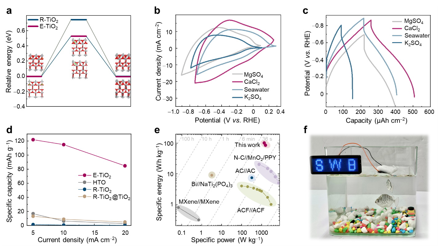 要點5:圖5a的DFT計算表明,E-TiO2同樣可以降低其他陽離子的擴散勢壘(例如Ca2+)。通過CV和GCD(圖5b,c)可知,E-TiO2在其他電解液中也具有類似于儲鈉時的贗電容主導特性。當電流密度為10mA/cm2時,E-TiO2儲存Ca2+和Mg2+的面容量分別為247和182 μAh/cm2,接近Na+的容量(259 μAh/cm2)。直接使用天然海水作為電解液,構建了以E-TiO2為負極材料,電催化劑為正極的海水二次電池。在5 mA/cm2的電流密度下,E-TiO2的比容量為152 mAh/g(圖5d)?;谡摌O活性物質的質量,新型海水電池的比能量/功率密度優(yōu)于當前報道的可充放海水儲能器件、水系鈉鉀及鎂鈣離子電池(圖5e)。團隊對二次海水電池的原型也進行了展示(圖5f)。
