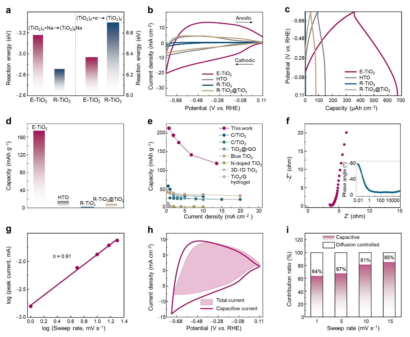(f)晶格膨脹二氧化鈦的EIS結果;(g)b值;(h)電容/擴散行為分析;(i)不同掃速下電容與擴散控制對容量的貢獻率。