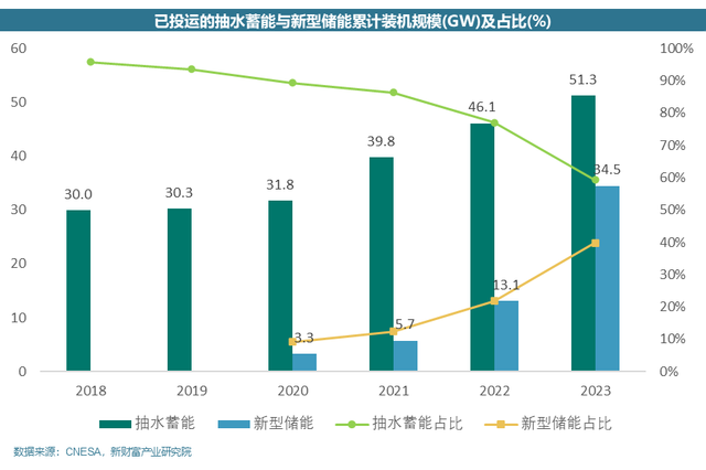 根據(jù)中國能源研究會儲能專委會及中關(guān)村儲能產(chǎn)業(yè)技術(shù)聯(lián)盟(CNESA)提供的數(shù)據(jù),到2023年底,抽水蓄能的累計裝機容量為51.3吉瓦,市場份額從2022年的77.1%降至59.4%。相比之下,新型儲能裝機量達(dá)到34.5吉瓦,容量為74.5吉瓦時,同比增長達(dá)到163.36%,市場份額也從2022年的21.9%上升到39.9%。