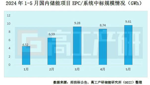 智通財(cái)經(jīng)獲悉,依據(jù)GGII發(fā)布的《高工儲(chǔ)能行業(yè)數(shù)據(jù)庫》不完全統(tǒng)計(jì),5月國(guó)內(nèi)共有46個(gè)儲(chǔ)能項(xiàng)目EPC/系統(tǒng)公布中標(biāo)結(jié)果,中標(biāo)規(guī)模達(dá)9.61GWh,較上月增長(zhǎng)10%,1-5月中標(biāo)容量規(guī)模累計(jì)達(dá)38.74GWh。