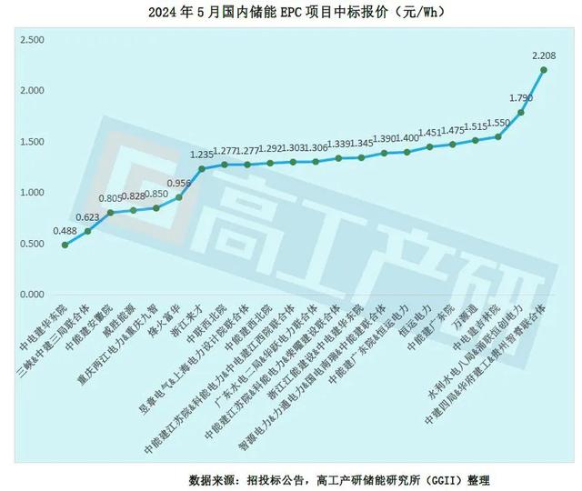 5月,國(guó)內(nèi)儲(chǔ)能項(xiàng)目EPC總承包報(bào)價(jià)在0.488-2.208元/Wh之間,均價(jià)為1.174元/Wh,較上月下降11%。最高價(jià)來自貴州黔西市100MW/200MWh電網(wǎng)側(cè)集中式共享儲(chǔ)能電站項(xiàng)目EPC總承包,中建四局&華府建工&貴州智睿聯(lián)合體以2.208元/Wh中標(biāo);最低價(jià)為中國(guó)電建集團(tuán)華東勘測(cè)設(shè)計(jì)研究院有限公司以0.488元/Wh的價(jià)格中標(biāo)舟山定海工業(yè)園區(qū)共享儲(chǔ)能電站項(xiàng)目一期。