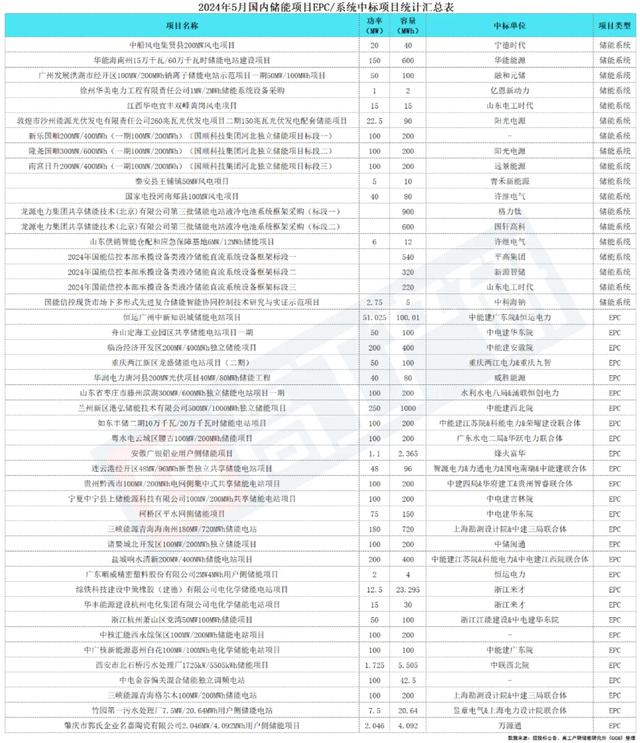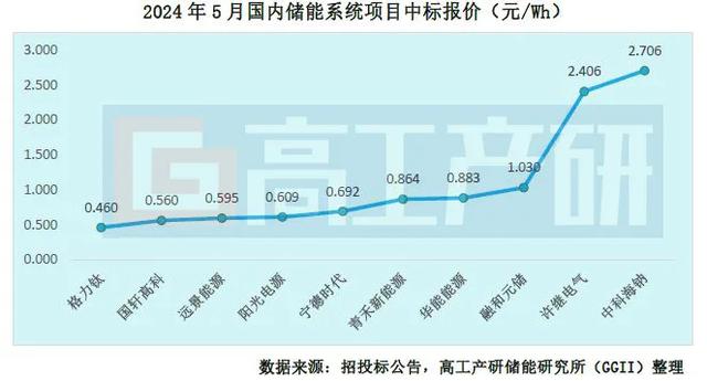 5月中標(biāo)項(xiàng)目包括28個(gè)儲(chǔ)能EPC項(xiàng)目,18個(gè)儲(chǔ)能系統(tǒng)采購(gòu)項(xiàng)目。價(jià)格方面,儲(chǔ)能系統(tǒng)采購(gòu)的單價(jià)在0.460-2.706元/Wh的范圍內(nèi),均價(jià)為0.641元/Wh,較上月下滑10%。最高價(jià)來自國(guó)能信控現(xiàn)貨市場(chǎng)下多形式先進(jìn)復(fù)合儲(chǔ)能智能協(xié)同控制技術(shù)研究與實(shí)證鈉離子電池示范項(xiàng)目,中科海納以2.706元/Wh中標(biāo);最低價(jià)來自龍?jiān)措娏瘓F(tuán)共享儲(chǔ)能技術(shù)(北京)有限公司第三批儲(chǔ)能電站液冷電池系統(tǒng)框架采購(gòu)(標(biāo)段一),格力鈦中標(biāo)單價(jià)0.460元/Wh。