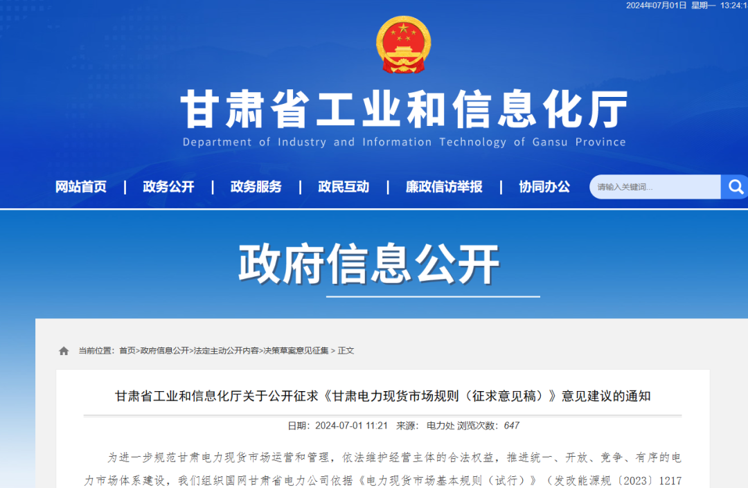 甘肅省工業(yè)和信息化廳關(guān)于公開征求《甘肅電力現(xiàn)貨市場(chǎng)規(guī)則(征求意見(jiàn)稿)》意見(jiàn)建議的通知