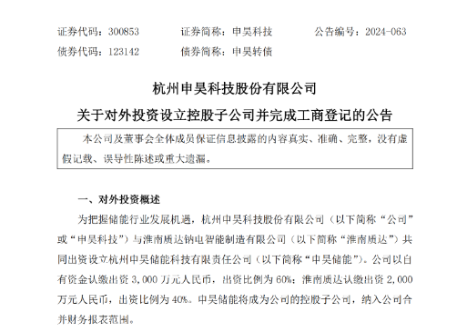 7月11日,杭州申昊科技股份有限公司發(fā)布關(guān)于對(duì)外投資設(shè)立控股子公司并完成工商登記的公告。公告顯示,為把握儲(chǔ)能行業(yè)發(fā)展機(jī)遇,杭州申昊科技股份有限公司(以下簡稱“申昊科技”)與淮南質(zhì)達(dá)鈉電智能制造有限公司(以下簡稱“淮南質(zhì)達(dá)”)共同出資設(shè)立杭州申昊儲(chǔ)能科技有限責(zé)任公司(以下簡稱“申昊儲(chǔ)能”),從事包括戶儲(chǔ)、工商業(yè)儲(chǔ)能、電網(wǎng)側(cè)儲(chǔ)能等業(yè)務(wù),擬研發(fā)虛擬電網(wǎng)技術(shù)和應(yīng)用,進(jìn)一步提升儲(chǔ)能資源的聚合和管控,實(shí)現(xiàn)數(shù)字能源新業(yè)態(tài),培育公司新的業(yè)務(wù)增長點(diǎn)。