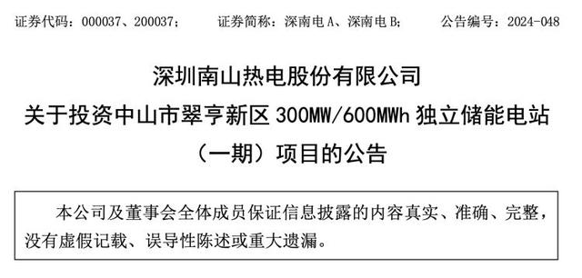 深南電A(000037)7月18日晚間公告,公司為搶抓儲能產(chǎn)業(yè)機(jī)遇,充分利用現(xiàn)有資源,盤活公司控股子公司深南電(中山)電力有限公司(以下簡稱“中山公司”)線路資產(chǎn),推動公司轉(zhuǎn)型發(fā)展,擬由中山公司與中山市南朗建設(shè)發(fā)展有限公司(以下簡稱“南朗公司”)共同成立項目公司,實施中山市翠亨新區(qū)300MW/600MWh獨(dú)立儲能電站(一期)項目建設(shè),建成1座規(guī)模為100MW/200MWh的獨(dú)立儲能電站。