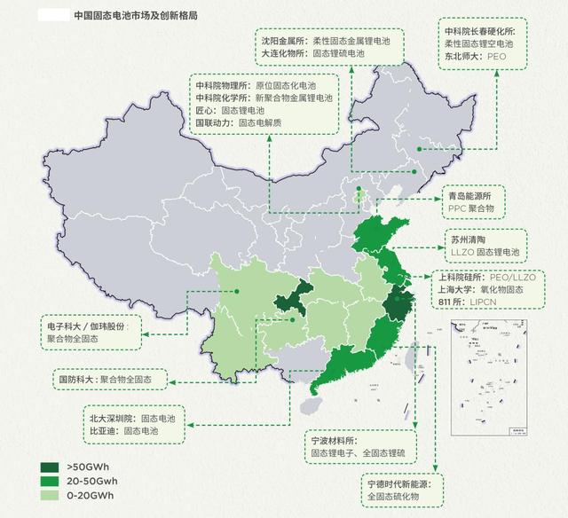 全國固態(tài)電池產(chǎn)能主要分布在廣東、長三角、重慶、北京等有較強(qiáng)科研實(shí)力和完善汽車產(chǎn)業(yè)鏈布局的地區(qū)。
