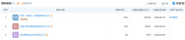 據(jù)信息顯示,內(nèi)蒙古華電阿拉善綠色能源有限公司的法定代表人是盧茂茂。該公司由華電(內(nèi)蒙古)新能源有限公司、內(nèi)蒙古阿拉善能源有限責任公司、以及阿拉善盟運達風(fēng)電有限公司共同持有股份,其中中國華電旗下的華電(內(nèi)蒙古)新能源有限公司持有80%的股份。