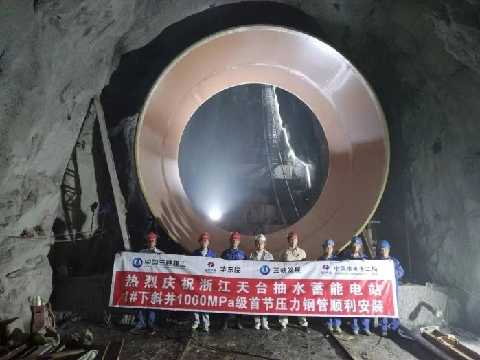 浙江天臺抽水蓄能電站1號下斜井首節(jié)壓力鋼管順利安裝(資料圖片)