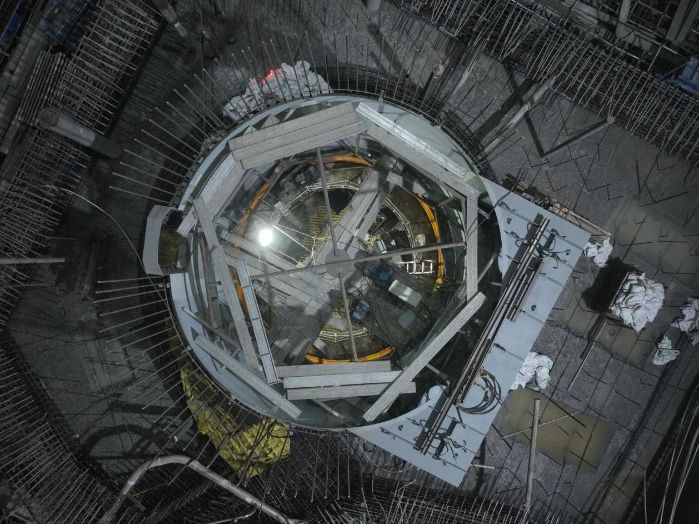 天臺抽蓄電站定子機(jī)座呈圓筒形,最大外形尺寸8.05米×8.05米×4.9米(長×寬×高),重量達(dá)80余噸,是發(fā)電電動機(jī)的重要靜止部件,它將固定定子鐵心,承擔(dān)發(fā)電電動機(jī)全部定子重量以及上機(jī)架和推力軸承重量,并承載從推力軸承傳遞下來的機(jī)組轉(zhuǎn)動部件重量及水推力負(fù)荷。此次定子機(jī)座順利安裝為后續(xù)推進(jìn)定子鐵心疊片、定子線棒安裝等機(jī)電工作奠定了堅實基礎(chǔ)。