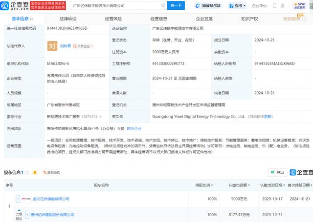 近日,廣東億緯數(shù)字能源技術(shù)有限公司成立,法定代表人為劉怡青,注冊(cè)資本為5000萬(wàn)元人民幣,經(jīng)營(yíng)范圍包含:合同能源管理;節(jié)能管理服務(wù);蓄電池租賃;機(jī)械設(shè)備租賃;光伏發(fā)電設(shè)備租賃;充電控制設(shè)備租賃等。企查查股權(quán)穿透顯示,該公司由億緯鋰能(300014)間接全資持股。