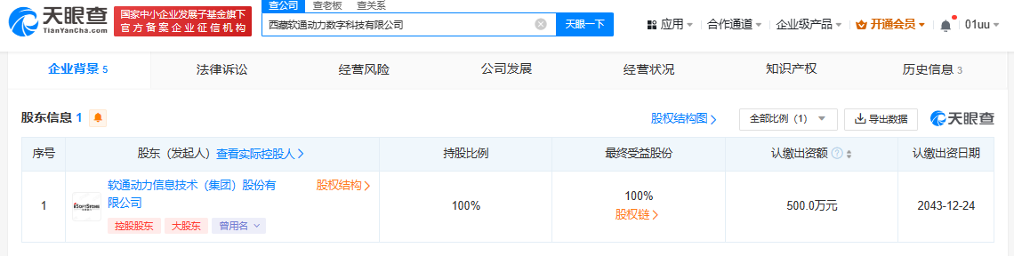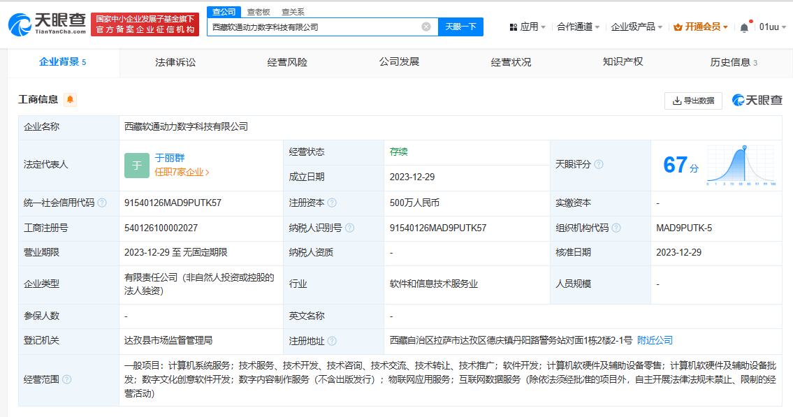 近日,西藏軟通動(dòng)力數(shù)字科技有限公司成立,法定代表人為于麗群,注冊(cè)資本500萬(wàn)人民幣,經(jīng)營(yíng)范圍包括數(shù)字文化創(chuàng)意軟件開發(fā)、數(shù)字內(nèi)容制作服務(wù)、物聯(lián)網(wǎng)應(yīng)用服務(wù)、互聯(lián)網(wǎng)數(shù)據(jù)服務(wù)等。股東信息顯示,該公司由軟通動(dòng)力(301236)全資持股。