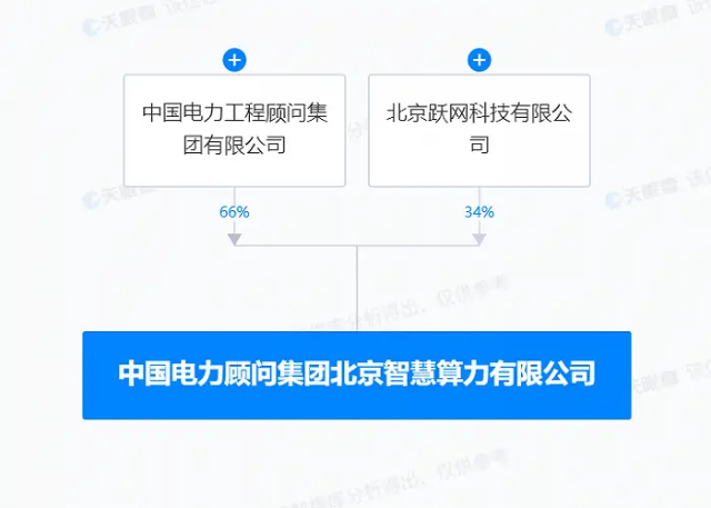 股權(quán)穿透顯示,該公司由中國能建旗下中國電力工程顧問集團(tuán)有限公司和北京躍網(wǎng)科技有限公司共同持股。