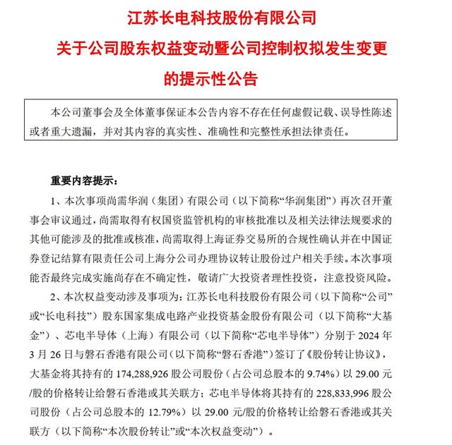 3月26日晚間,長(zhǎng)電科技(SH600584,股價(jià)28.25元,市值505.3億元)發(fā)布公告稱,公司股東國家集成電路產(chǎn)業(yè)投資基金股份有限公司(以下簡(jiǎn)稱“大基金”)、芯電半導(dǎo)體(上海)有限公司(以下簡(jiǎn)稱“芯電半導(dǎo)體”)分別與磐石香港有限公司(以下簡(jiǎn)稱“磐石香港”)簽訂《股份轉(zhuǎn)讓協(xié)議》,大基金及芯電半導(dǎo)體均以29元/股價(jià)格將合計(jì)所持22.53%公司股份轉(zhuǎn)讓給磐石香港或其關(guān)聯(lián)方;完成后公司控股股東將變更為磐石香港或其關(guān)聯(lián)方,實(shí)控人將變更為中國華潤(rùn),公司股票復(fù)牌。