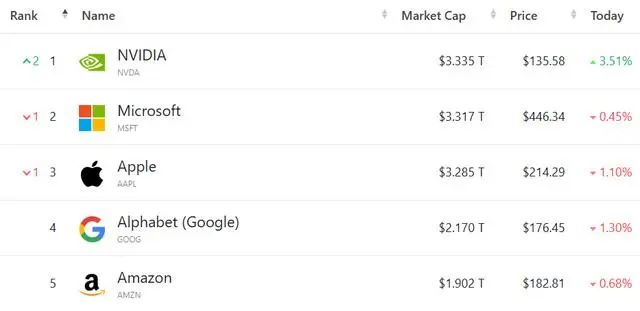 當(dāng)?shù)貢r間周二美股收盤,美國芯片企業(yè)英偉達(dá)上漲3.51%,報135.58美元再刷歷史新高,總市值達(dá)3.335萬億美元,一舉超過了微軟和蘋果,成為全球最具價值的上市公司。
