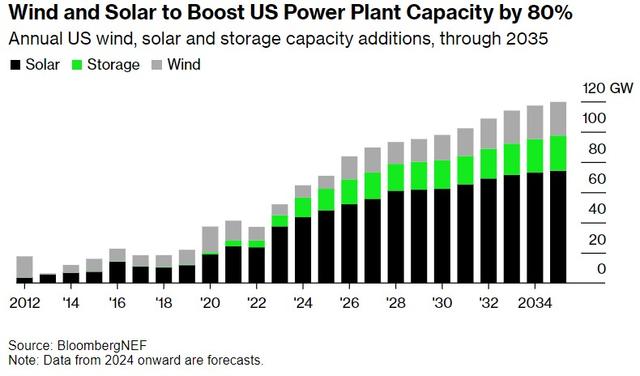 根據BloombergNEF預測數據,預計到2035年,美國總發(fā)電量將增加80%,主要得益于近1太瓦的新增太陽能和風能。