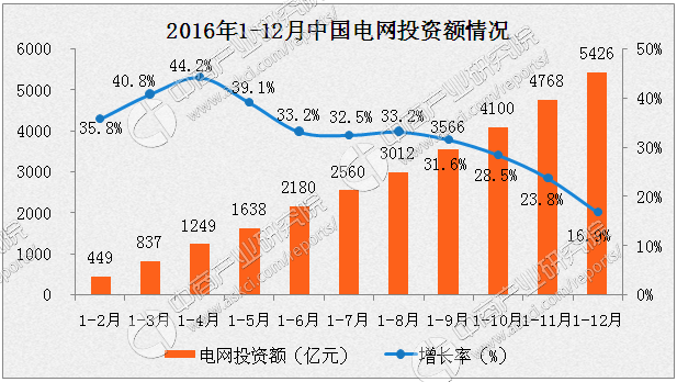 從電網(wǎng)投資來(lái)看,2016年1-12月,全國(guó)電網(wǎng)投資額達(dá)到5426億元,同比增長(zhǎng)16.9%。從月度增長(zhǎng)趨勢(shì)可見(jiàn),全國(guó)電網(wǎng)投資的增速逐漸放緩。