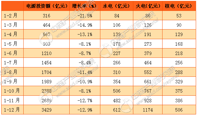 從電源投資來(lái)看,2016年1-12月,全國(guó)電源投資額達(dá)到3429億元,同比下降12.9%。其中,水電投資額為612億元,同比下降22.4%;火電投資額達(dá)到1174億元,同比增加0.9%;核電投資額為506億元,同比下降10.5%。